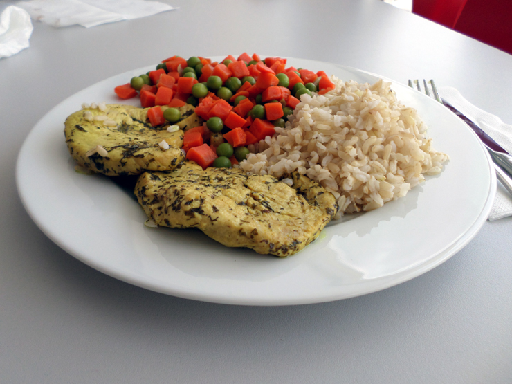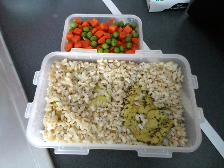 Sznycle z indyka z marchewką i groszkiem oraz ryżem brązowym